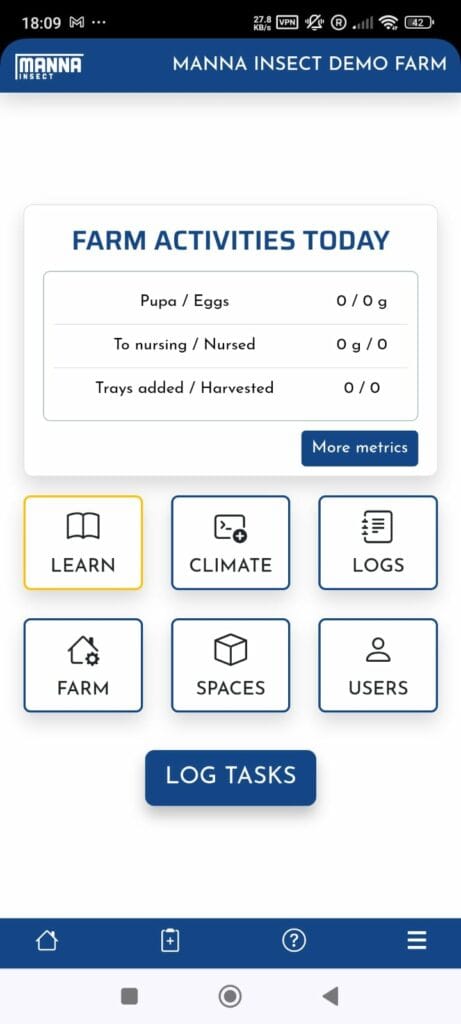 For those already using Manna Insect’s climatization technology, the MIND units, the FARM Hub gives access to all MIND-related training materials, the control panel, analytics, and more.